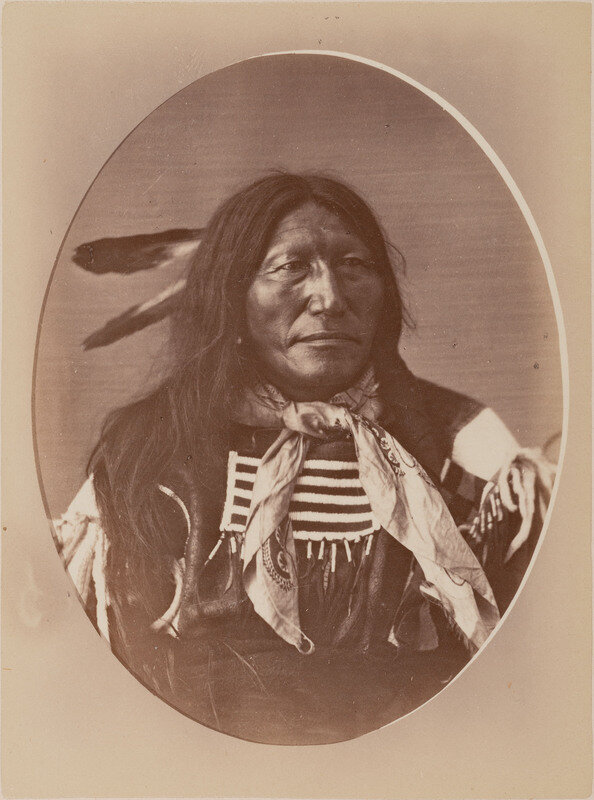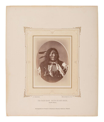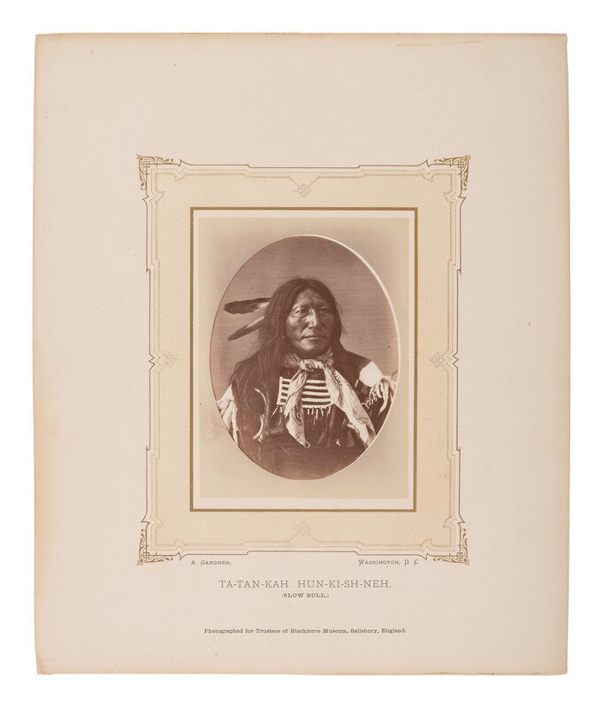 5 1/4 x 4 in. albumen photograph, tipped on ornately scrolled Blackmore Museum mount, 12 x 10 in., ca 1870. A studio portrait of Slow Bull, aka Ta-Tan-Kah Hun-Ki-Sh-Neh, with feathers in his hair, wearing a hide warrior shirt, a neck tie and a bone breast plate. Lower margin of mount with credit to A. Gardner, Washington, DC, and imprint, "Photographed by Trustees of Blackmore Museum, Salisbury, England."