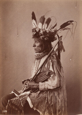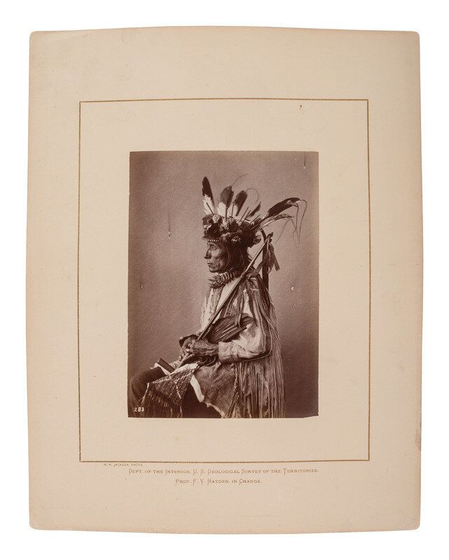 7 1/4 x 5 1/4 in. albumen photograph on 14 x 11 in. Hayden Survey mount with credit at lower left to W.H. Jackson. A studio view of Yankton Sioux Chief Medicine Bear. Research indicates that the photograph was originally taken by Alexander Gardner in 1872, although it has also been credited to William Henry Jackson.