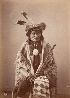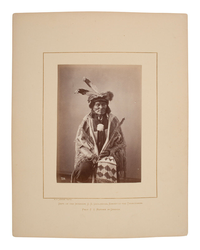 7 1/4 x 5 1/4 in. albumen photograph on 11 x 14 in. Hayden Survey mount with credit at lower left to W.H. Jackson. A studio view of Yankton Dakota Indian Long Fox, or Ta-Tan-Ka-Han-Ska, originally taken by Alexander Gardner in 1872.