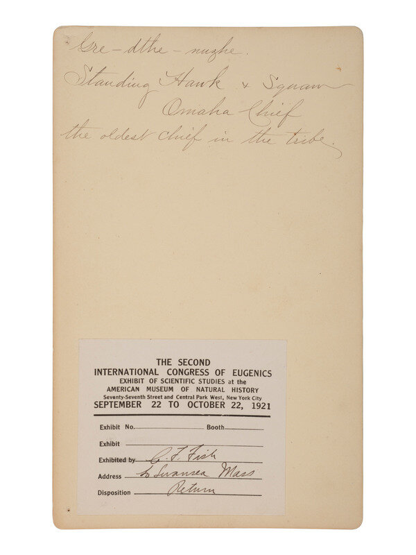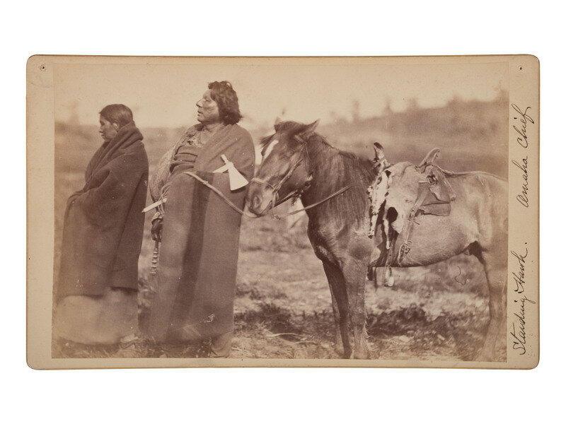 Boudoir photograph on cardstock mount of Standing Hawk with his wife, Mi-Ho-Ga, unmarked but by William Henry Jackson, ca 1868, with handwritten inscription on verso, "Gre-dthe-nuzhe. Standing Hawk and Squaw / Omaha Chief / the oldest chief in the tribe." With pasted label on verso from the "Second International Congress of Eugenics Exhibit of Scientific Studies," held at the American Museum of Natural History in the fall of 1921, with an ownership record of C.F. Fish of South Swansea, Massachusetts.