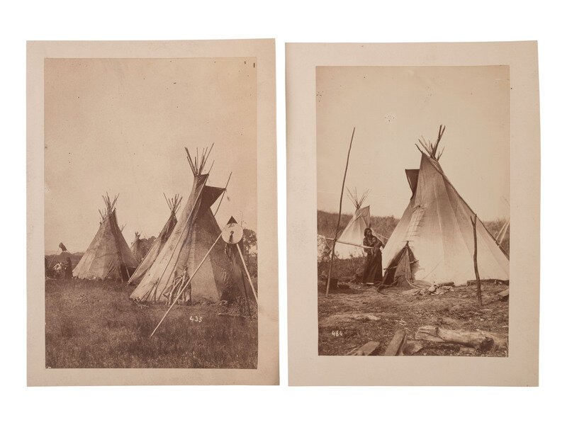 2 albumen photographs showing tipis in a prairie setting, approx. 8 x 5 1/2 in., or smaller, on 9 x 6 1/2 in. cardstock mounts, lacking studio imprints but originally taken by William Henry Jackson. Includes: Tipis of Gi-he-ga, an Omaha chief. -- A view of a temporary camp site comprised of tipis constructed with buffalo skins and cedar poles. Note the scalp on the shield in the foreground. This image has also been credited to William S. Soule.