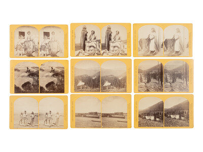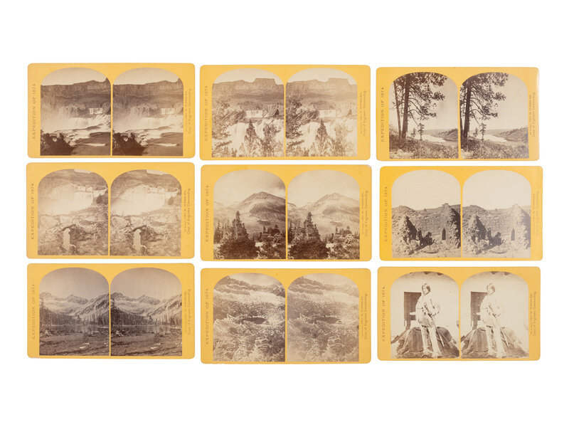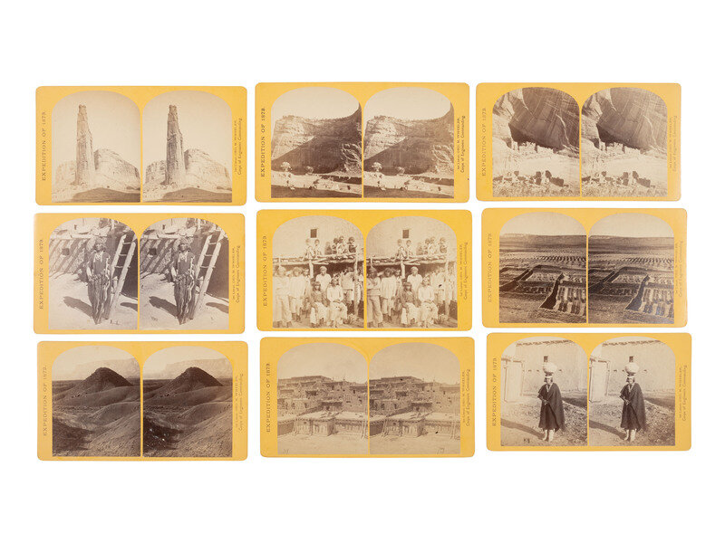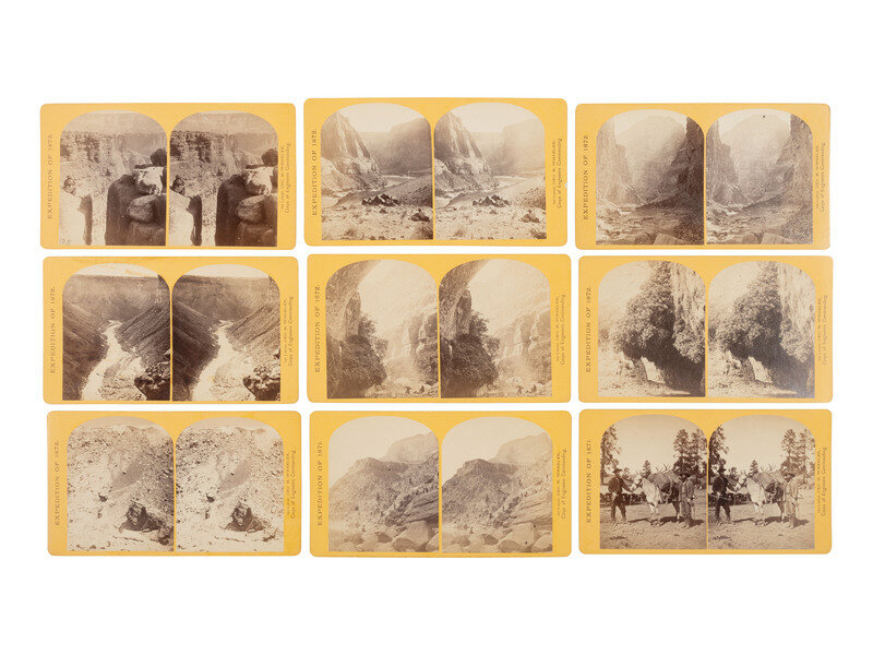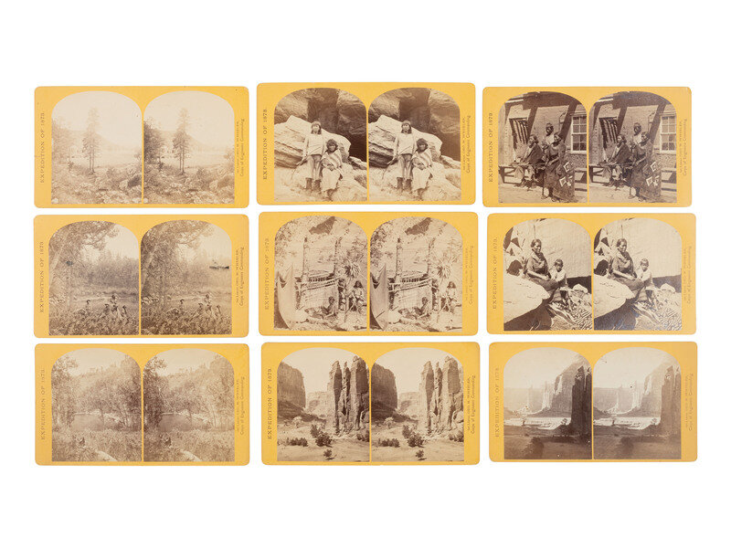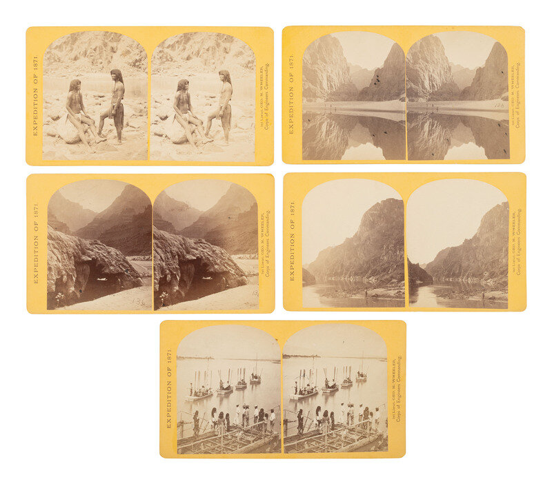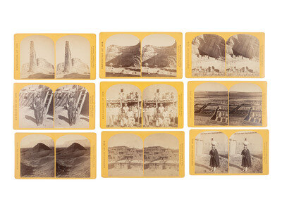 Set of 50 stereoviews documenting the Wheeler Expeditions of 1871-1874, as photographed by Timothy H. O'Sullivan and William Bell. Numbered 1-50 on 4 x 7 in. mounts with the year of the expedition and "1st Lieut. Geo. M. Wheeler, Corps of Engineers Commanding," imprinted on recto, and on verso "War Department, Corp of Engineers, U.S.A. / Geographical Explorations and Surveys West of the 100th Meridian," followed by a specific description of each view and photo credit to either O'Sullivan or Bell.