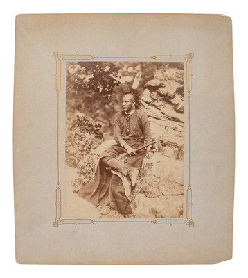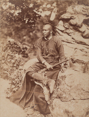Approx. 9 1/4 x 7 in. albumen photograph, on original 15 x 13 in. mount, uncredited but known to have been taken by John K. Hillers. The subject poses among rocks at the Grand Council in Okmulgee, Indian Territory, 10 May 1875.