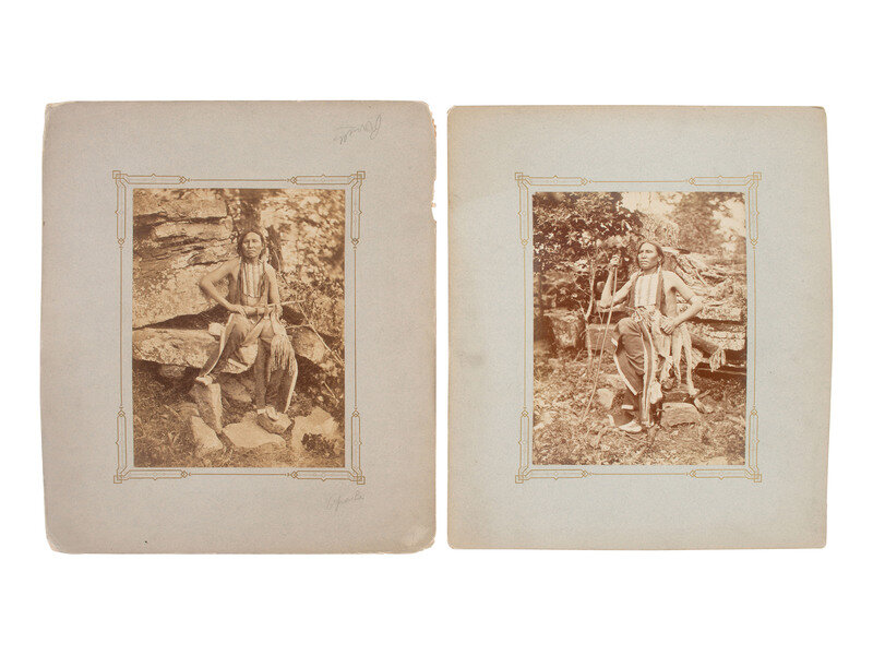 2 albumen photographs, approx. 9 x 7 in., on original 15 x 13 in. cardstock mounts, uncredited but known to have been taken by John K. Hillers. The photographs depict Little Bear, a Cheyenne warrior, also known as, Na-ku-has-kit, wearing a breastplate and holding a bow and quiver, posed among rocks at the Grand Council in Okmulgee, Indian Territory, 10 May 1875.
