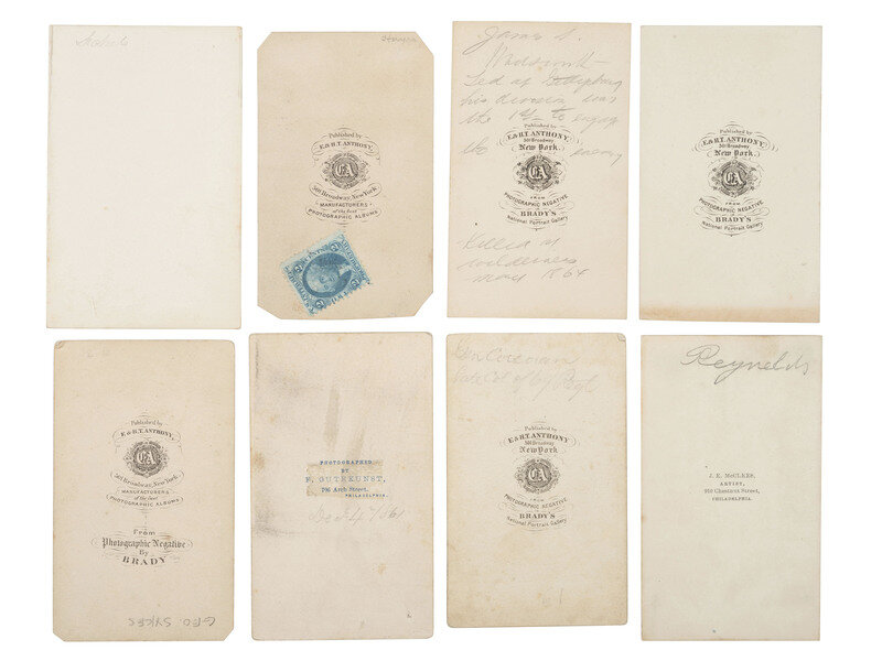 Standing portrait of Daniel SICKLES with sword. Washington, DC: Brady, n.d. Sickles lost his leg due to a wound sustained at the Battle of Gettsburg. -- Standing portrait of Richard H. RUSH with sword. Philadelphia, PA: McAllister & Brother, 1861. With Gutekunst imprint on verso. -- Seated portrait of Winfield Scott HANCOCK. New York: E. & H. T. Anthony (from Brady negative), n.d. -- Standing outdoor portrait of James S. WADSWORTH with sword. New York: E. & H. T. Anthony (from Brady negative), n.d. Wadsworth was mortally wounded in 1864 at the Battle of the Wilderness. -- Vignetted bust portrait of John F. REYNOLDS. Philadelphia, PA: J. E. McClees, n.d. Reynolds was KIA at Gettysburg. -- And 3 others including Michael CORCORAN, Alexander HAYS (KIA in 1864 at the Battle of the Wilderness), and George SYKES. -- Together, 8 CDVS.
