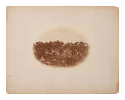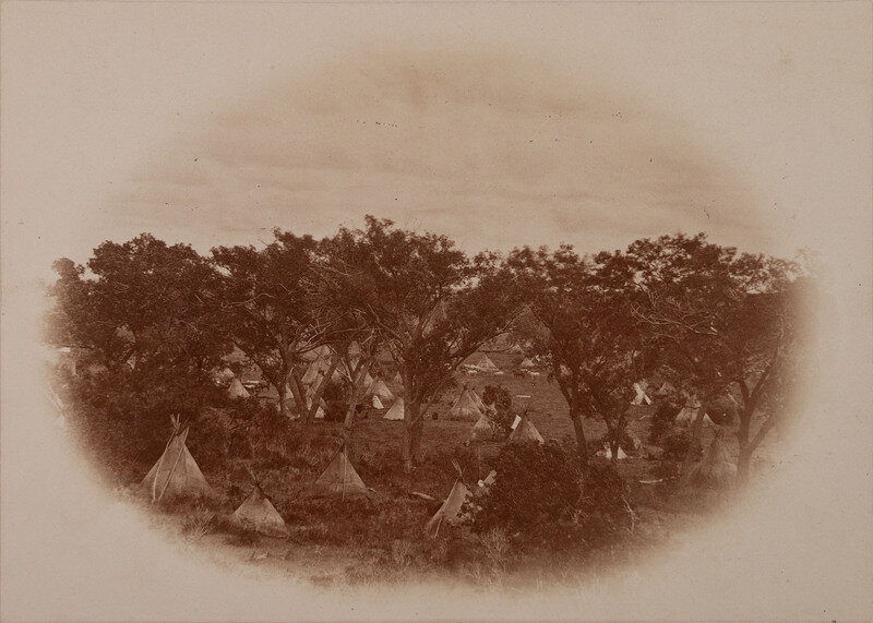 5 5/8 x 8 in. albumen photograph on 10 3/4 x 13 3/4 in. cardstock mount. A distant view of an Indian encampment taken near the Canadian River around the fall of 1868. Dozens of tipis are visible, standing among the trees. Another example of the photograph is held at the Huntington Library, with an inscription indicating that this image captures a Kiowa encampment.