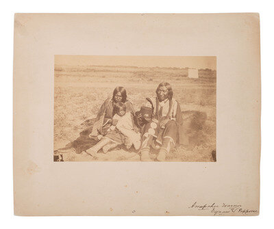 5 1/8 x 7 3/4 in. albumen photograph on 10 x 11 3/4 in. cardstock mount with period inked caption at lower right, "Arrapahoe [sic] Warrior, Squaw, and Pappoose [sic]." It has been suggested that the notation was written in Soule's hand, but this cannot be confirmed with all certainty.