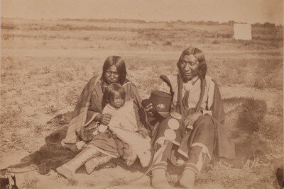 An outdoor photograph of an Arapahoe family seated on a buffalo robe. The warrior is shown holding a befeathered Hardee hat with infantry insignia.