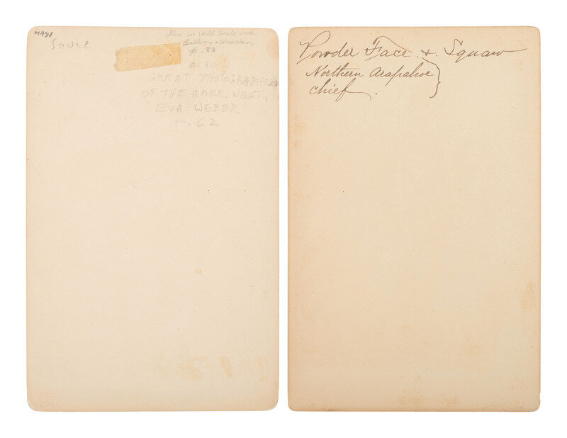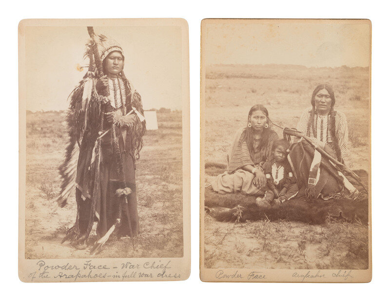 2 cabinet photographs on cardstock mounts of Powder Face and his family, each unmarked but taken by Will Soule. Both photographs include manuscript notation on mount recto and/or verso. Scenes include: "Powder Face - War Chief of the Arapahoes [sic] in full war dress." The chief wears full feather bonnet and trail, bone breastplate, a blanket about his waist, and he holds an otter fur-wrapped lance with feather drops, and a pipe tomahawk. -- "Powder & Squaw, Northern Arapahoe Chief," as captioned on verso. Powder Face is shown seated on a fur blanket with his wife and young child.