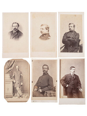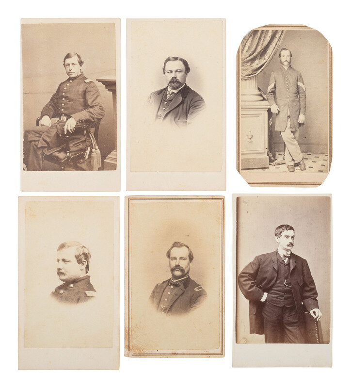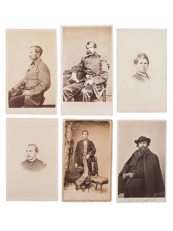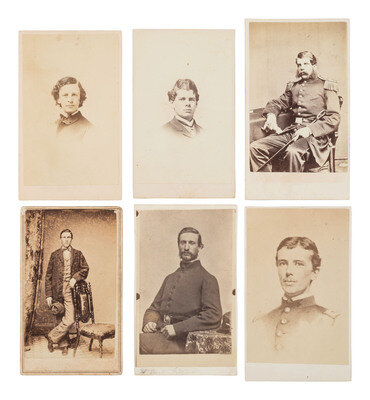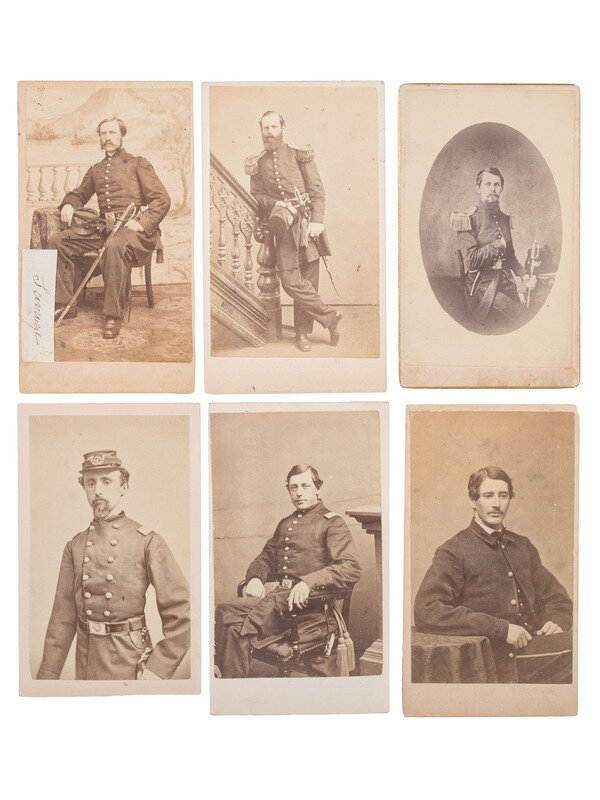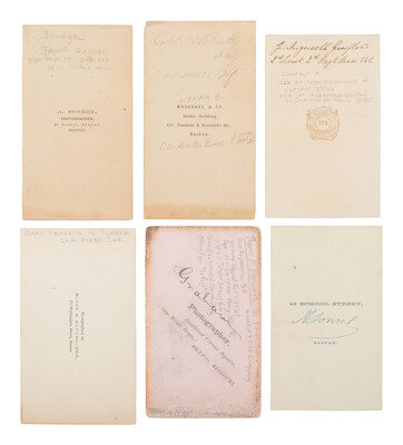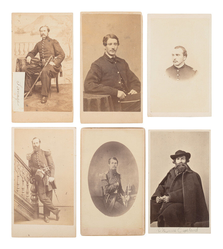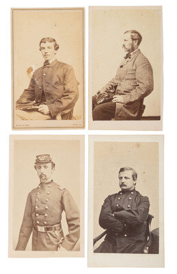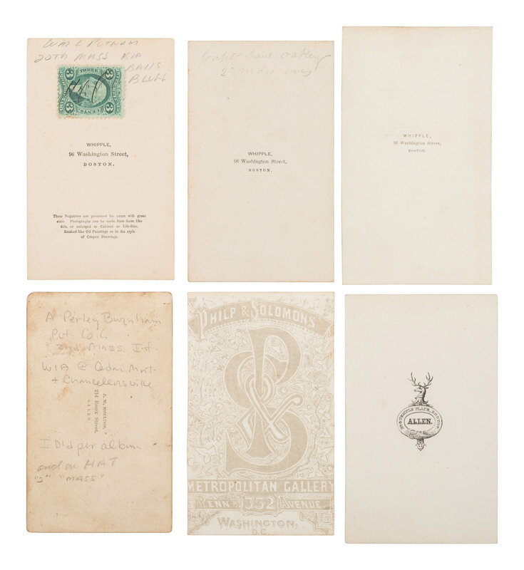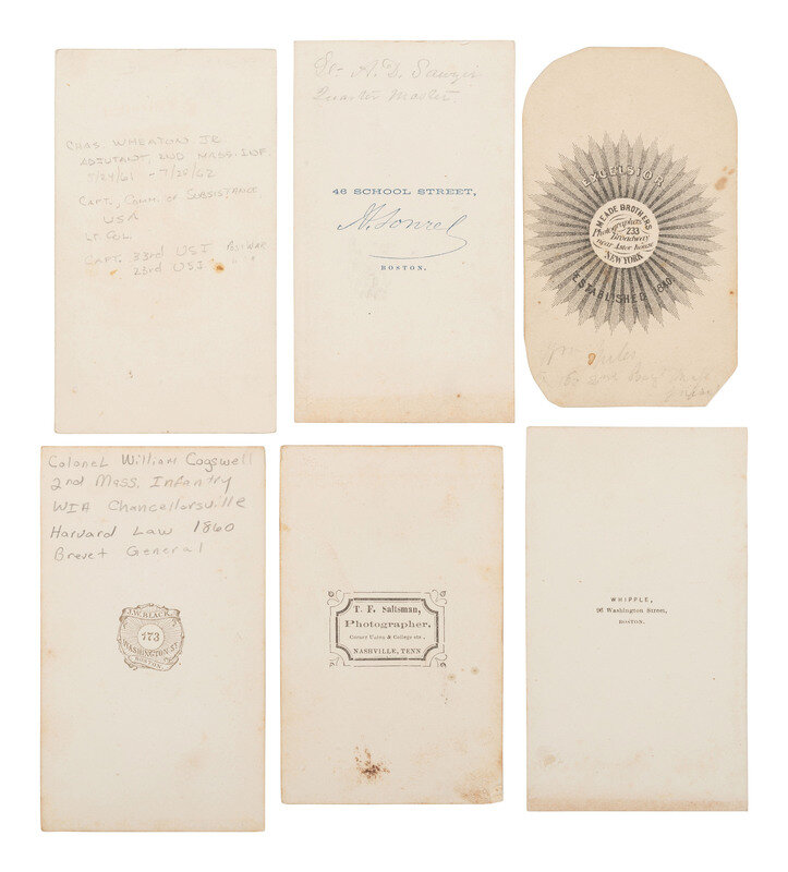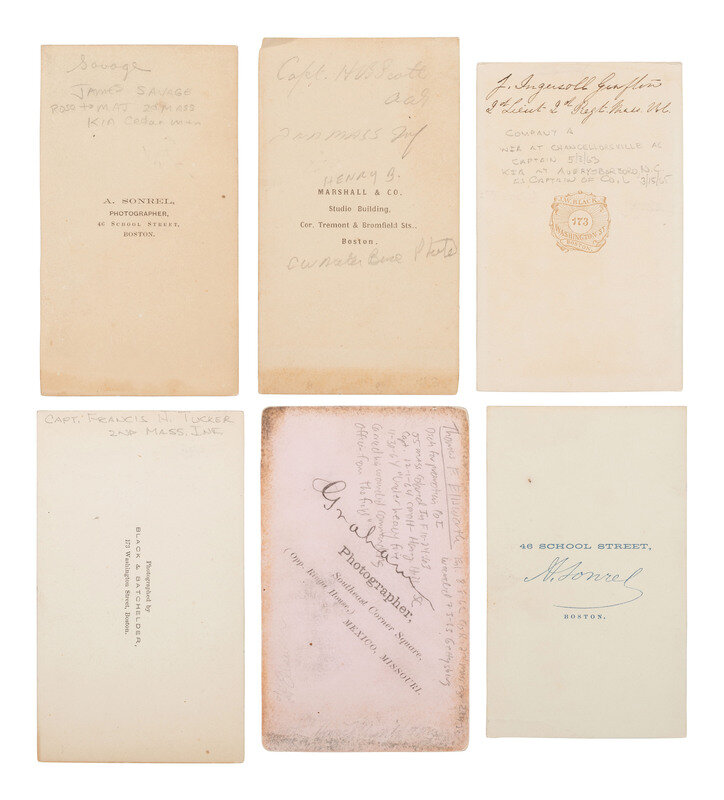 Thomas Foulds ELLSWORTH, WIA at Gettysburg, by Graham, Mexico, MO. -- Robert Morris COPELAND, by A. Sonrel, Boston, MA. -- Francis H. TUCKER, by Black & Batchelder, Boston, MA. -- James SAVAGE Jr. (2), DOW sustained at Cedar Mountain, by A. Sonrel, Boston, MA and J. W. Black, Boston, MA. -- Henry Bruce SCOTT, by Marshall & Co., Boston, MA. -- J. Ingersoll GRAFTON, WIA at Chancellorsville, by J.W. Black, Boston, MA. -- Samuel M. QUINCY, WIA at Cedar Mountain, by J.W. Black, Boston, MA. -- William COGSWELL (2), WIA at Chancellorsville, each by J. W. Black, Boston, MA. -- Anson D. SAWYER, by A. Sonrel, Boston, MA. -- William A. MILES, by Meade Brothers, New York, NY. -- Charles WHEATON, Jr., uncredited. -- Amos P. BURNHAM, WIA at Cedar Mountain and Chancellorsville, by J. W. Moulton, Salem, MA. -- Daniel OAKEY, WIA at Cedar Mountain, by Whipple, Boston, MA. -- Richard C. GOODWIN, KIA at Cedar Mountain, by Whipple, Boston, MA. -- Marcus Morton HAWES, by Whipple, Boston, MA. -- Gerald FITZGERALD, KIA at Chancellorsville, by Philp & Solomons, Washington, DC. -- Together, 18 CDVs.
