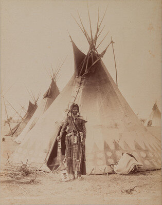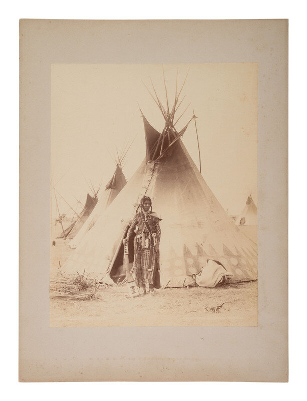 9 1/4 x 7 1/4 in. albumen photograph on 12 3/4 x 9 1/2 in. cardstock mount, faintly titled in the negative "A Young Blackfoot Brave," and credited to Notman & Son, Montreal. A young man dressed with a beaded flat bag and beaded bandolier stands with his rifle sheathed in its hide scabbard in front of a painted tipi.