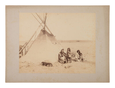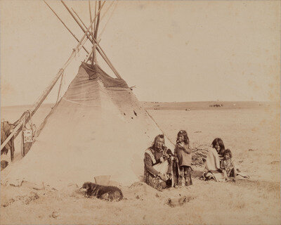 A father, mother, their two children, and a dog casually pose in front of their tipi. The man, wearing a war shirt, smokes a pipe and the family's travois can be seen leaning against the dwelling.