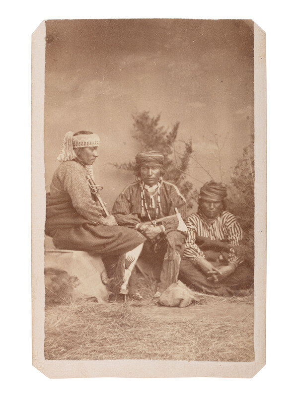 CDV on cardstock mount, verso imprint of A.C. Hull, Fremont, Nebraska. All three men wear finger-woven yarn sashes wrapped around their heads. The man at left has beaded legging strips with designs of bear's tracks. He holds a light cavalry saber in its sheath. The man at center holds a pipe-tomahawk.