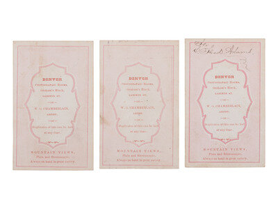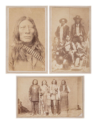 3 CDVs on cardstock mount with verso imprint of W.G. Chamberlain, Denver, Colorado. Subjects include: An intimate portrait of an unidentified Native American wearing a .44-40 cartridge belt. -- Group portrait of four braves, one armed with a lever action rifle, one with a revolver, and one with a percussion rifle. -- CDV, possibly a copy image of five elaborately dressed Native Americans. -- Together, 3 CDVs.