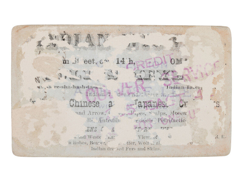 CDV on cardstock mount with inscription in lower margin, "Julius Meyer & Pawnee Chiefs," uncredited but originally published by Frank F. Currier, Omaha, Nebraska. Mount verso with partially visible imprint of the "Indian Wigwam," the curio shop operated by Julius Meyer in Omaha, Nebraska. A "Culver Service" ink stamp is also included on verso.