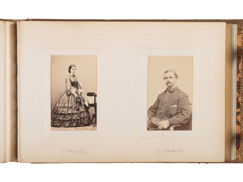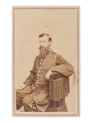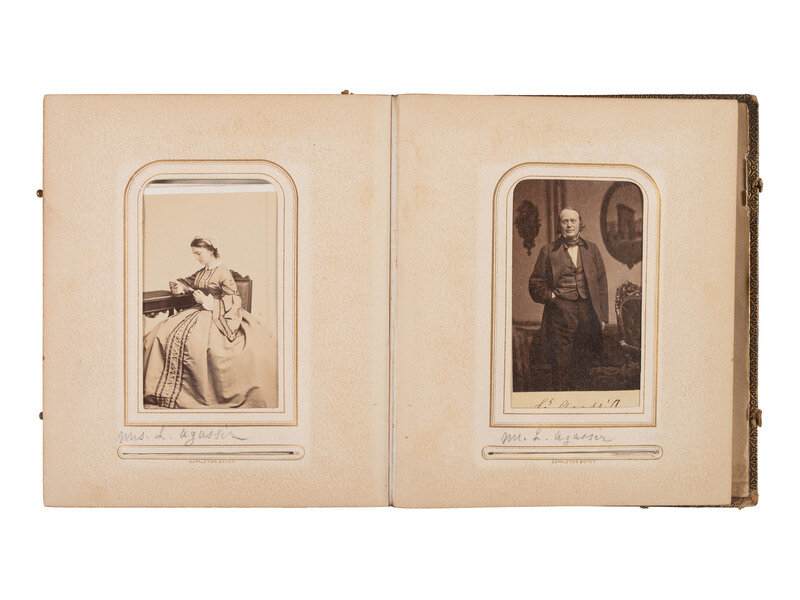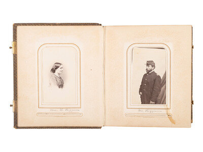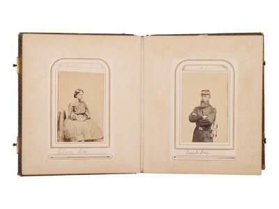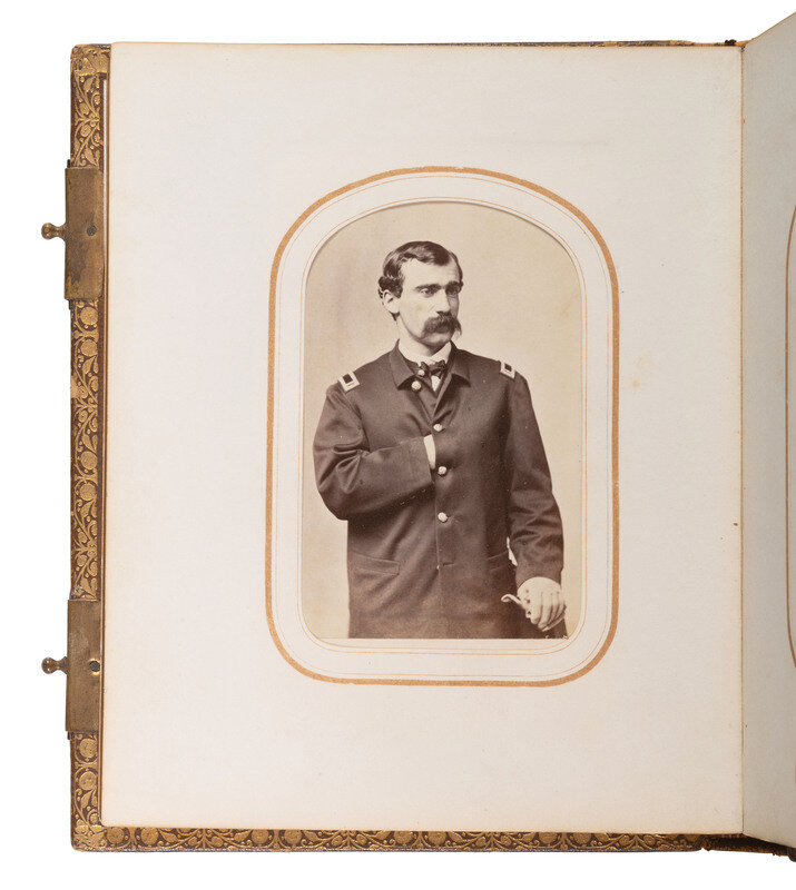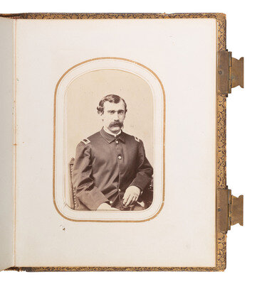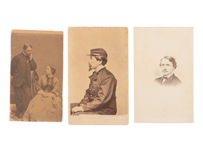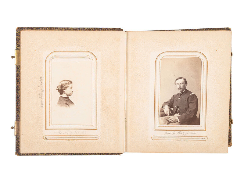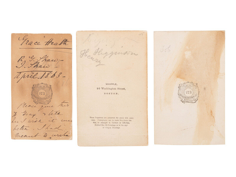 Collection comprises approx. 103 CDVs, highlighted by: Vignetted bust portrait of Robert Gould SHAW in civilian clothing. Boston, MA: J. W. Black, n.d. -- Studio portrait of Robert Gould SHAW in uniform, looking down at his seated sister, Josephine Shaw. Boston, MA: J. W. Black, [1863] (significant toning, some wear, clipped along all edges). Lengthy ink inscription to verso reads "Grace Heath / R. G. Shaw - / J. Shaw - / April. 1863 - / Please give this to Gray & tell her I wish it wer[e] better. I had meant to write [remainder of text clipped]." -- Seated portrait of a unknown bearded captain in uniform, identified only as "Shaw" on verso. Uncredited. -- 2 portraits of James Jackson Higginson, 1st Massachusetts Cavalry, in first lieutenant's uniform. Boston, MA: Whipple, n.d. James Higginson was promoted to captain in September of 1864. -- 2 seated studio portraits of Henry Lee Higginson, 2nd Massachusetts Infantry and 1st Massachusetts Cavalry, WIA at Aldie, VA, in uniform. One by J. W. Black, the other by Whipple. Higginson was ultimately promoted to lieutenant colonel by brevet in March of 1865. -- Full standing portrait of a bushy-bearded Francis "Frank" L. Lee in uniform. Boston, MA: J. W. Black, n.d. Signed and inscribed to Boston socialite Grace Heath on verso: "Miss Grace Heath with the best love, Col Francis L. Lee." Lee received a commission as major of the 4th Massachusetts Infantry Battalion in May of 1862, and a few months thereafter was commissioned a colonel of the 44th Massachusetts Infantry. He served in that capacity until mustering out in June of 1863. The prominent Lee family was also connected with the Higginson family. -- Seated studio portrait of a uniformed captain only identified as "Shaw" on verso. Uncredited, n.d. The bearded man could be a member of the Shaw family, but we could find no images of Shaws matching this portrait. -- And a standing studio portrait of Louis Agassiz, signed on mount recto and inscribed to Grace Heath on verso. Uncredited, n.d.
