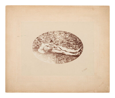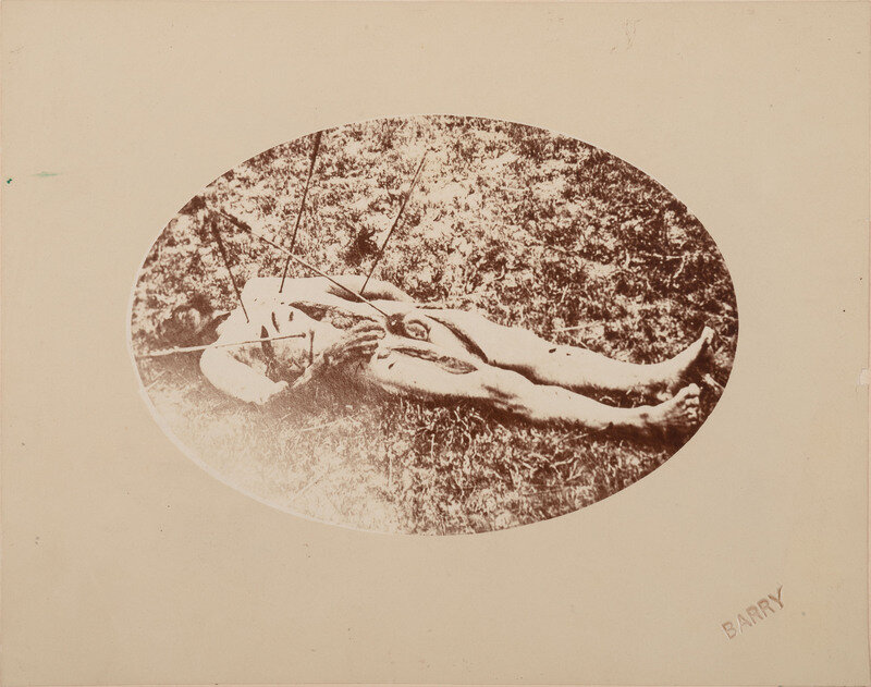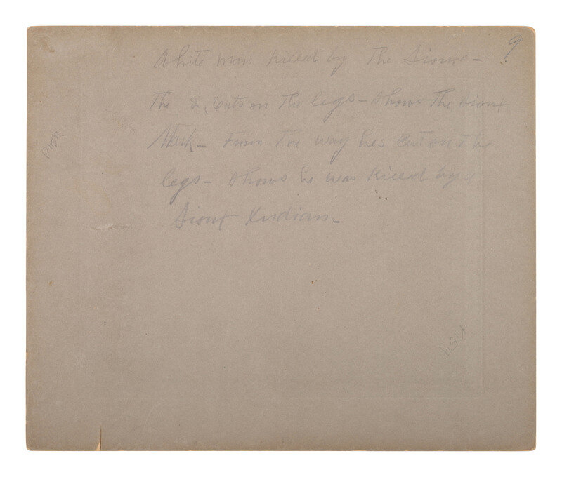 4 x 6 in. oval vignette, mounted on larger 10 x 12 in. board, with blindstamp of Barry in both the photograph and on the mount. With penciled inscription on verso, "White Man Killed by the Sioux The 2 cuts on the legs show the Sioux mark - From the way he's cut on the legs - shows he was killed by a Sioux Indian."