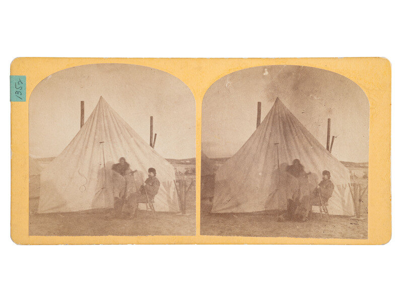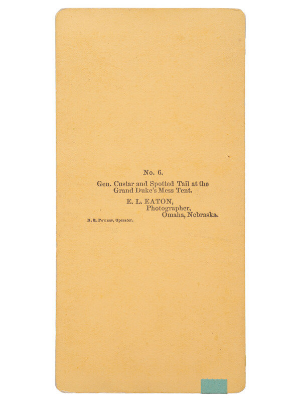 Stereoview on cardstock mount, verso with printed title, "No. 6. Gen. Custar [sic] and Spotted Tail at the Grand Duke's Mess Tent," and credit to E.L. Eaton, Photographer, Omaha, Nebraska, and D.B. Powers, Operator. A view capturing Lieutenant Colonel Custer and Spotted Tail together in front of a tent, January 1872.