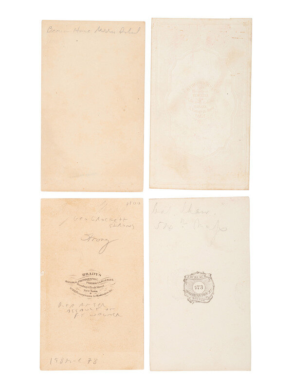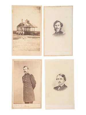 Vignetted bust portrait of Robert Gould Shaw in civilian clothing. Boston: J. W. Black, n.d. Verso bears penciled identification above Black's imprint. Gould Shaw was serving as Colonel of the 54th Massachusetts, United States Colored Troops, when he was killed in action at the Battle of Fort Wagner on 7/18/63. -- Standing portrait of George Crockett Strong in uniform. New York: Brady's national Photographic Portrait Galleries, n.d. Verso bears pencil identification and further inscription above and below Brady's imprint. Strong had just been promoted to Major General, and was serving in that capacity when he was wounded at the Battle of Fort Wagner on 7/18/63. He succumbed to his wounds just over a week later on 7/30/63.-- Vignetted bust engraved portrait of Haldimand Sumner Putnam in uniform. New York: C. D. Fredricks & Co., n.d. Verso bears faded imprint. A graduate of West Point, Putnam was serving as Colonel of the 7th New Hampshire Infantry Regiment when he was killed in action at the Battle of Fort Wagner on 7/18/63. -- Together, 3 CDVs.