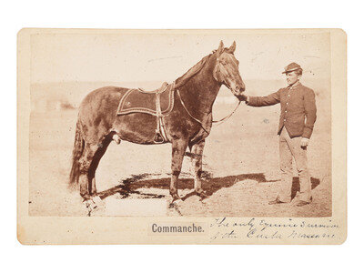 Cabinet photograph on cardstock mount of the war horse Comanche, the only survivor of the Custer Massacre, with a caretaker. Mount with applied paper label identifying Comanche and inked notation in lower margin, "The only Equine Survivor of the Custer Massacre." Verso with Barry's Bismarck and Standing Rock, D.T. imprint.