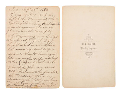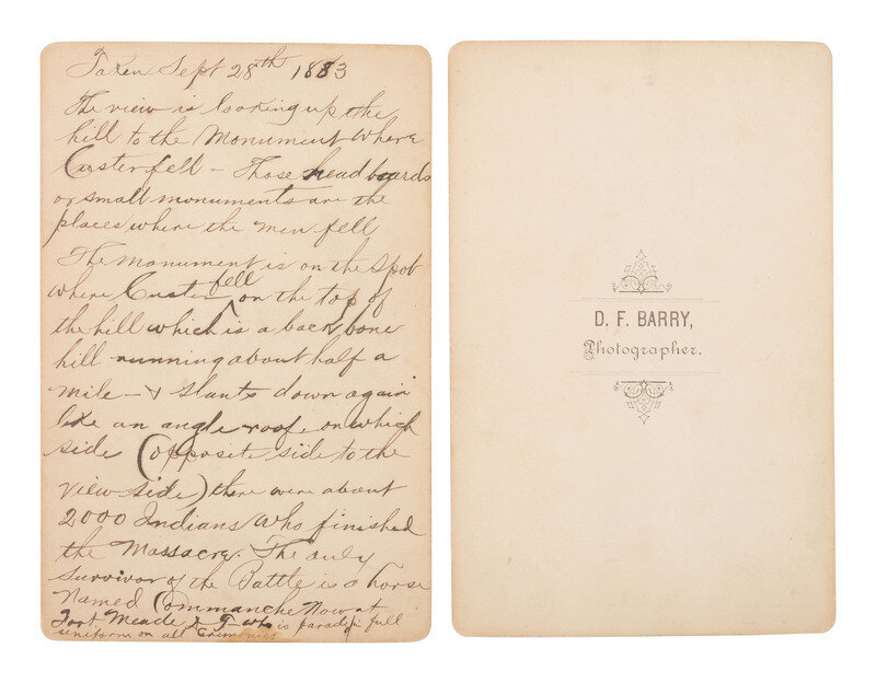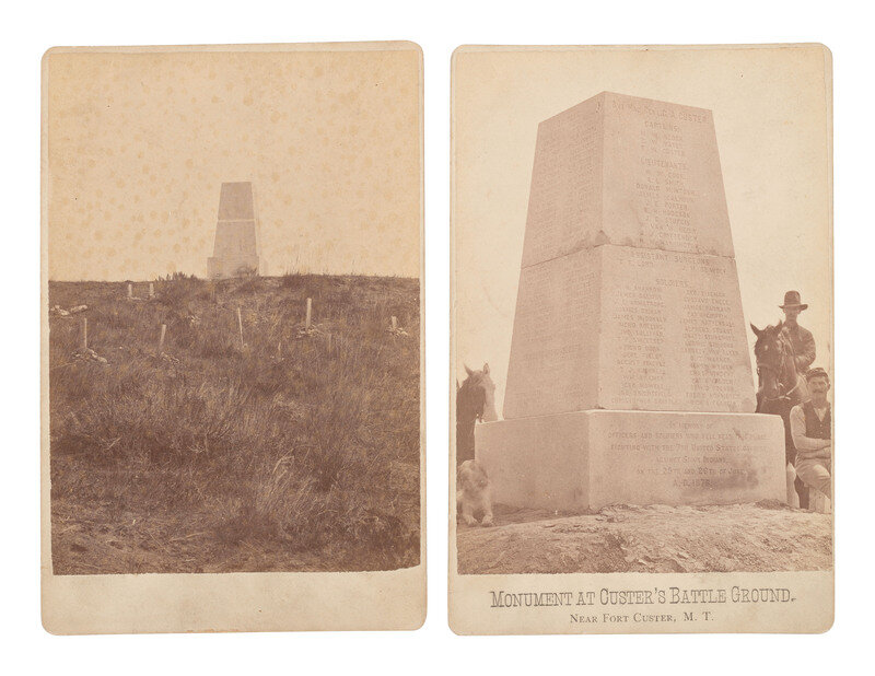 2 cabinet photographs on cardstock mounts, the first with caption in lower margin, "Monument at Custer's Battle Ground. Near Fort Custer, M.T.," and verso imprint of D.F. Barry. Fully visible in the image are two men and a dog sitting on either side of the Little Bighorn Battlefield National Monument memorial obelisk, erected in 1881 by the War Department. It lists the names of the officers and soldiers "who fell near this place fighting with the 7th United States Cavalry against Sioux Indians." -- Uncredited view of the monument, with detailed period inscription on verso in an unknown hand, noting that the image was taken on 28 September 1883. The inscription states, in part, "The monument is on the spot where Custer fell on the top of the hill which is a backbone hill running about a half mile...(opposite side to the view side) there were about 2000 Indians who finished the Massacre. The only Survivor of the Battle is a horse named Commanche [sic] now at Fort Meade..." A modern typed note accompanies the cabinet card, indicating that the photograph was collected by Thomas Gibbon, who was stationed in Butte, Montana with the US Army in the Signal Corps, and became good friends with the Crow Indian Chiefs and their families at the nearby reservation. No further provenance accompanies the the image or the lot.