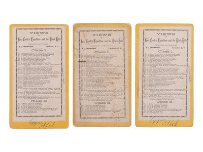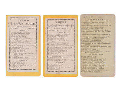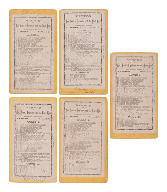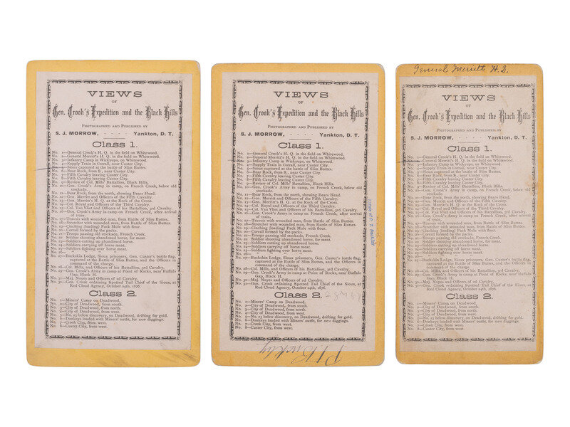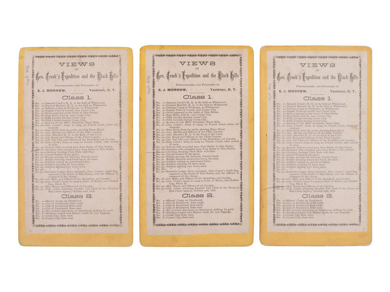 19 stereoviews, nearly all cabinet-sized and on yellow mounts, each bearing S. J. Morrow's Yankton, Dakota Territory imrpint. Most from his "Views of General Crook's Expedition and the Black Hills" series. Nearly all feature Morrow's printed series label on verso with corresponding image number and caption notated.