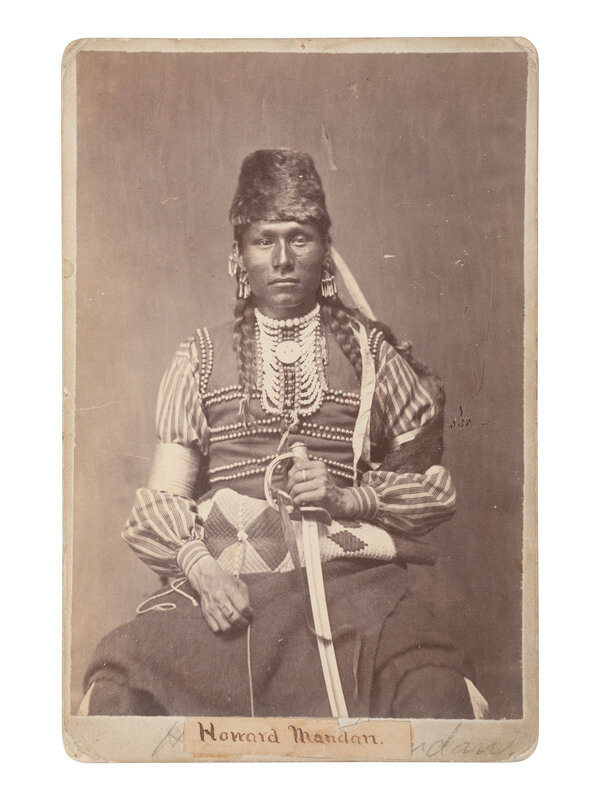 Cabinet photograph on cardstock mount, applied paper label on verso identified to "M.A. Breese & Co.," with a list of titles included in "Collection No. 14" from their "Pictures of the Most Noted Indians, Fort A. Lincoln, D.T." While the image was published by Breese & Co., it may have been originally taken by O.S. Goff. An inscribed, applied paper label on mount recto identifies the subject as "Howard Mandan," and an additional inked notation on verso states that he was "killed by Crees." The scout is shown seated with a sword in hand.