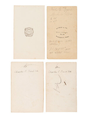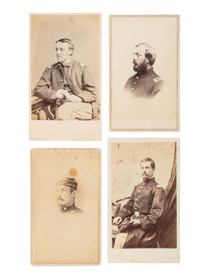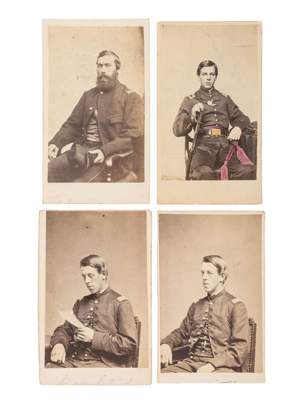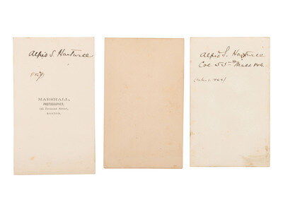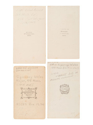 10 CDV portraits of officers who served in the 54th and/or 55th Massachusetts Infantry Regiments, United States Colored Troops. Subjects include: General Alfred Stedman HARTWELL (2), who served as Captain of Company D., 54th Massachusetts, and Colonel of the 55th Massachusetts. WIA at Honey Hill, SC. -- Charles Pickering BOWDITCH (2), who served as Lieutenant of Company A, 55th Massachusetts, and Captain of Company F, 5th Massachusetts (another colored regiment). -- Frederick E. ROGERS , who served as 2nd Lieutenant of Company A, 54th Massachusetts. WIA at Eppes' Bridge, SC. -- William Pickering HALLOWELL, who served as 1st Lieutenant and Adjutant of the 55th Massachusetts. -- Sigourney WALES (2), who served as Captain of Company F, 55th Massachusetts, and later promoted to Major in November of 1863. -- Cabot RUSSELL, who served as 1st Lieutenant of Company D, 54th Massachusetts, and later promoted to Captain of Company H, same regiment. KIA at Fort Wagner, SC. -- George T. Garrison, the son of famous abolitionist William Lloyd Garrison, and who achieved multiple ranks, including Brevet Major, in the 55th Massachusetts. -- Together, 10 CDVs.