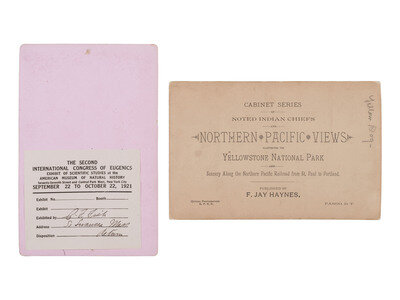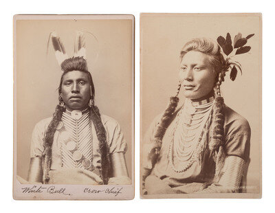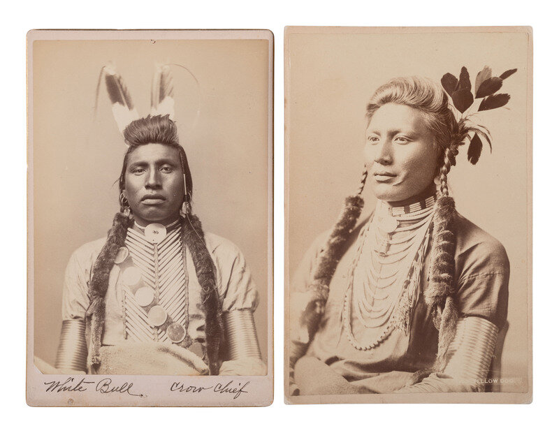 Subjects include: Yellow Dog, also known as Old Coyote, a Crow warrior present at the Little Bighorn battle and pursued by Generals Terry and O'Neil into Canada. -- White Bull, Crow chief. Verso with pasted label from the "Second International Congress of Eugenics Exhibit of Scientific Studies," held at the American Museum of Natural History in the fall of 1921, with an ownership record of C.F. Fish of South Swansea, Massachusetts. Joseph White Bull (1849-1947) was Sitting Bull's nephew. He was present at Little Bighorn and is reputed to have killed Custer. As with all oral histories, White Bull on other occasions claimed only to have struggled with Custer.
