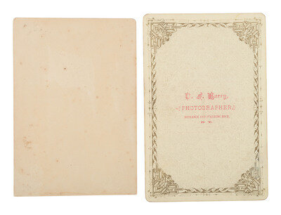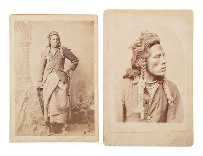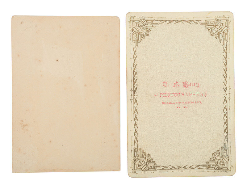 2 cabinet photographs on cardstock mounts, one with D.F. Barry's Bismarck and Standing Rock, D.T., imprint on verso, the other uncredited but also taken by Barry. Includes an oval bust photograph showing Curley in profile, wearing beaded necklaces, a large hoop earring in his right ear, and fur-wrapped braids, and a standing portrait that appears to have been taken during the same session.