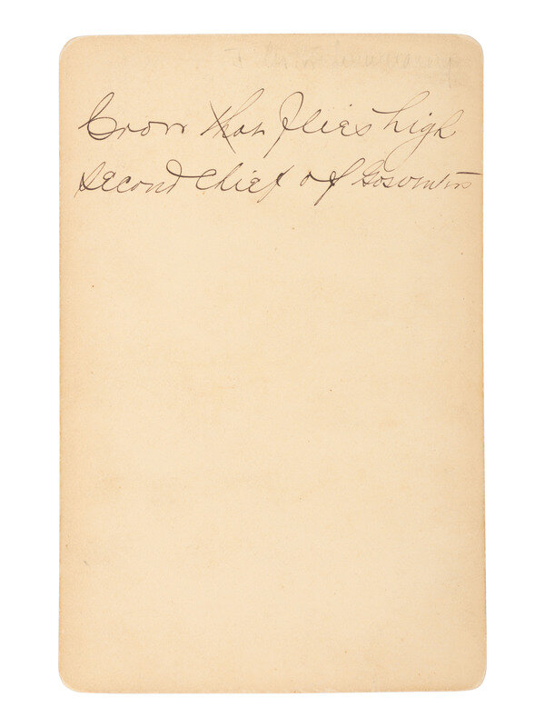 Cabinet photograph on cardstock mount. Uncredited but likely taken by O.S. Goff. Mount verso inscribed "Crow that flies high / second chief of Gosvontre [sic]." The Gros Ventre or Hidatsa chief wears a beaded shirt and feathered headdress and holds a US cavalry sword.