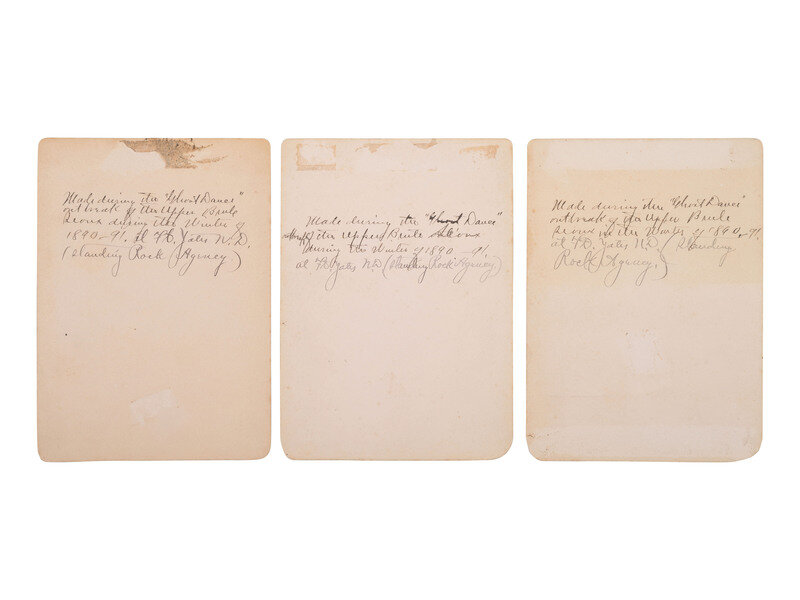 3 cabinet photographs on cardstock mounts, each unmarked but attributed to George W. Scott of Fort Yates, North Dakota. Each subject is identified in an unknown hand on mount recto, with additional notation on verso, which reads, "Made during the 'Ghost Dance' outbreak of the Upper Brule Sioux during the Winter of 1890-91, at Ft. Yates, N.D. (Standing Rock Agency)." Previous owner's name, "D. Powell Johnson Jr." written in red ink in upper margin of each image. Subjects include: Chief Gall. -- Long Dog. -- "Grand Son of Rain in the Face in Dance Costume," as identified on mount. -- Together, 3 cabinet photographs of Sioux Indians.