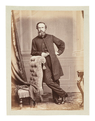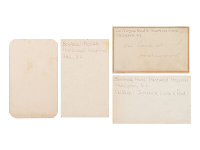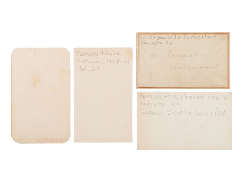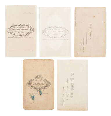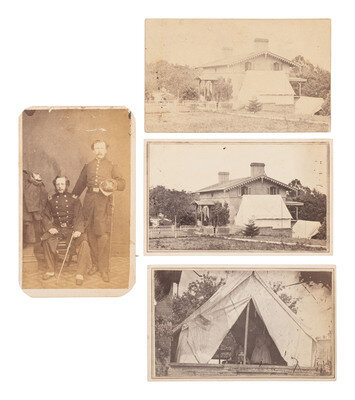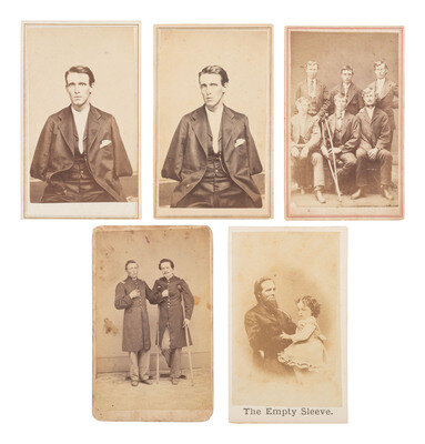 9 CDVs, including: 2 poses featuring double amputee Alfred Stratton from the same sitting. New York: K. W. Beniczky, n.d. Stratton is seated, with both of his empty suit sleeves pinned at about elbow length. Stratton, an enlistee of Company G, 147th New York, was wounded by a cannonball during attacks on Petersburg in 1864. -- Standing portrait of a Union officer propped up on crutches and appearing to one leg amputated below the knee, together with another officer who appears to be using his hand to steady his partner. Reading, PA: Patton & Lee, n.d. Remnants of a revenue stamp remain on verso. -- Group portrait of 6 young men, likely Civil War veterans, including one seated in the middle of the front row missing one leg and holding a crutch. The man seated in the front row to the viewer's right appears to be missing an arm. Kittanning, PA: C. C. Shadle, n.d. -- Portrait of a pair of medical officers in uniform, including swords. Uncredited, n.d. -- 3 views featuring a tent outside outside a house identified by verso inscription as the home of Surgeon Reed Bontecou, near Harewood Hospital in Washington, DC. Uncredited, n.d. -- An example of "The Empty Sleeve" image featuring amputee Henry Meacham holding his young daughter in his lap. Worcester, MA: C. P. Critcherson, n.d. -- Together, 9 CDVs.