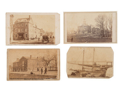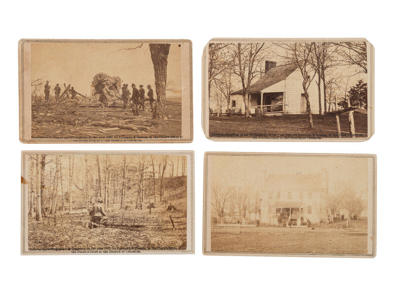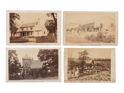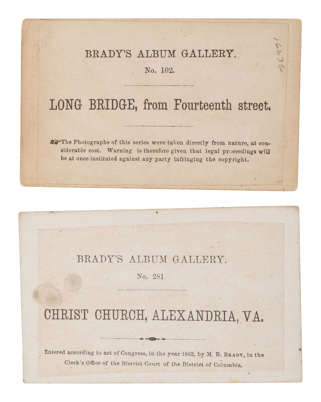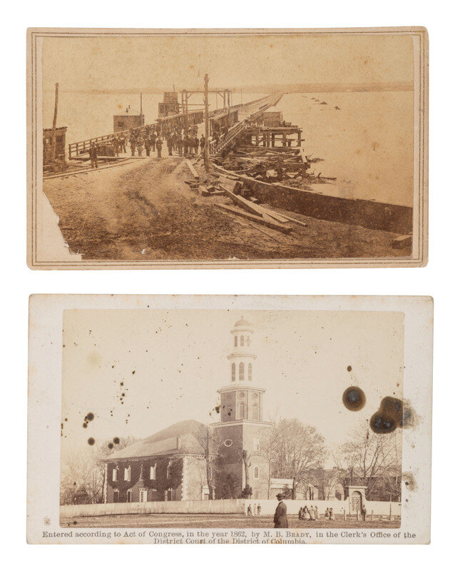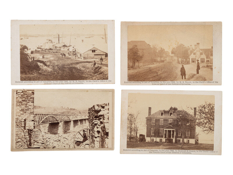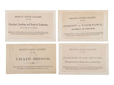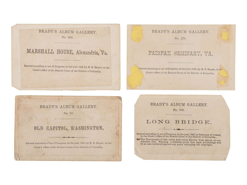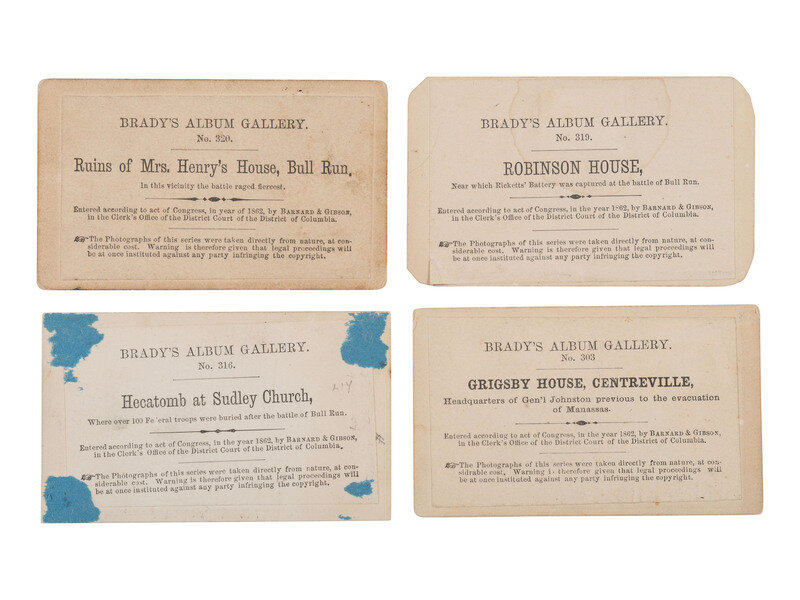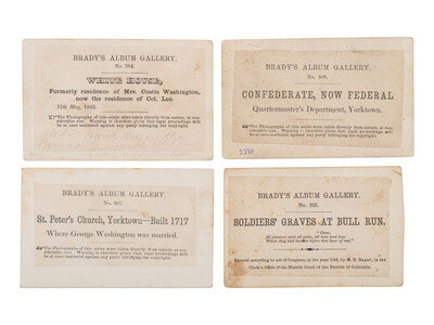 A group of 18 CDVs, each with verso label for Brady's Album Gallery, most with copyright on mount recto. Views include: No. 10. / Old Capitol, Washington. -- No. 100. / Long Bridge. -- No. 279. / Fairfax Seminary, VA. -- No. 280. / Marshall House, Alexandria, Va. -- No. 303. / Grigsby House, Centreville, Headquarters of Gen'l Johnston previous to the evacuation of Manassas. -- No. 316. / Hecatomb at Sudley Church, Where over 100 Federal troops were buried after the battle of Bull Run. -- No. 319. / Robinson House, Near which Ricketts' Battery was captured at the battle of Bull Run. -- No. 320. / Ruins of Mrs. Henry's House, Bull Run. In this vicinity the battle raged fiercest. -- No. 325. / Soldiers' Graves at Bull Run. "Gone All pleasure and all pain, all hate and love Which they had known before that hour of rest." -- No. 384. / White House, Formerly residence of Mrs. Custis Washington, now the residence of Col. Lee. -- No. 400. / Confederate, Now Federal Quartermaster's Department, Yorktown. -- No. 407. / St. Peter's Church, Yorktown—Built 1717 Where George Washington was married. -- And 6 others.