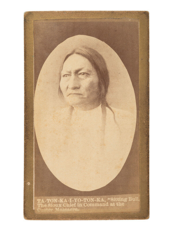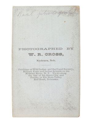 CDV on cardstock mount of "Ta-Ton-Ka-I-Yo-Ton-Ka 'Sitting Bull, The Sioux Chief in Command at the Custer Massacre,'" as identified below the portrait. Verso imprint of W.R. Cross, Niobrara, Nebraska. Cross is believed to have taken the first portrait of Sitting Bull, from which this CDV was created.