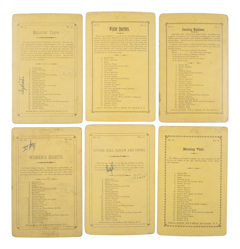 11 stereoviews on cardstock mounts. Versos with printed number, title, information of subject, list of titles in series, and Bailey, Dix, & Mead credit. The photographs were taken by William R. Cross at Fort Randall during Sitting Bull's internment before being transferred to Standing Rock in May of 1883.