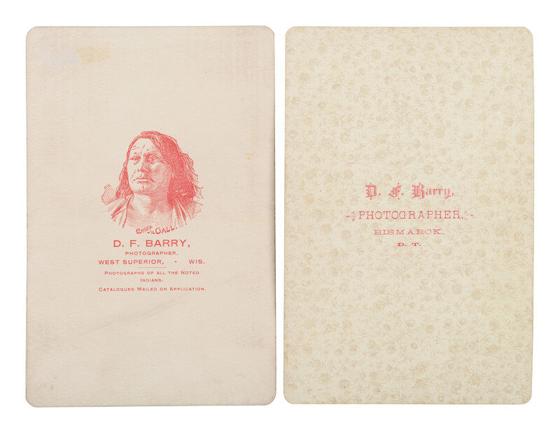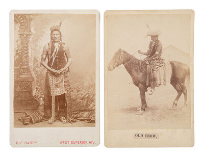 2 cabinet photographs on cardstock mounts, each showing Lakota warrior Old Crow, possible bodyguard to Chief Sitting Bull. Includes: Old Crow mounted on horseback, wearing a unique headdress. Identified on applied paper label, with Barry's Bismarck, D.T. imprint on verso, ca 1880s. -- Portrait of Old Crow standing in a studio setting, with Barry's West Superior, Wisconsin imprint on recto and verso, ca 1890s. -- Together, 2 cabinet photographs.