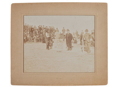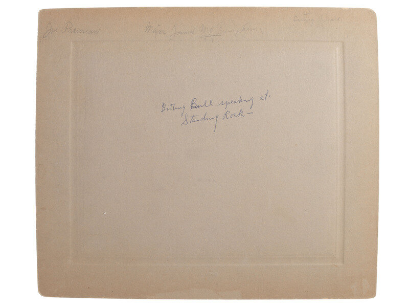 10 1/8 x 8 1/4 in. silver gelatin print on 13 7/8 x 11 7/8 in. mount with "Barry" blindstamp to mount recto and image. Verso bears pencil inscriptions along upper edge identifying the subjects as Joe Premeau, Major James McLaughlin, and Sitting Bull; and a modern ink inscription reading "Sitting Bull speaking at Standing Rock."