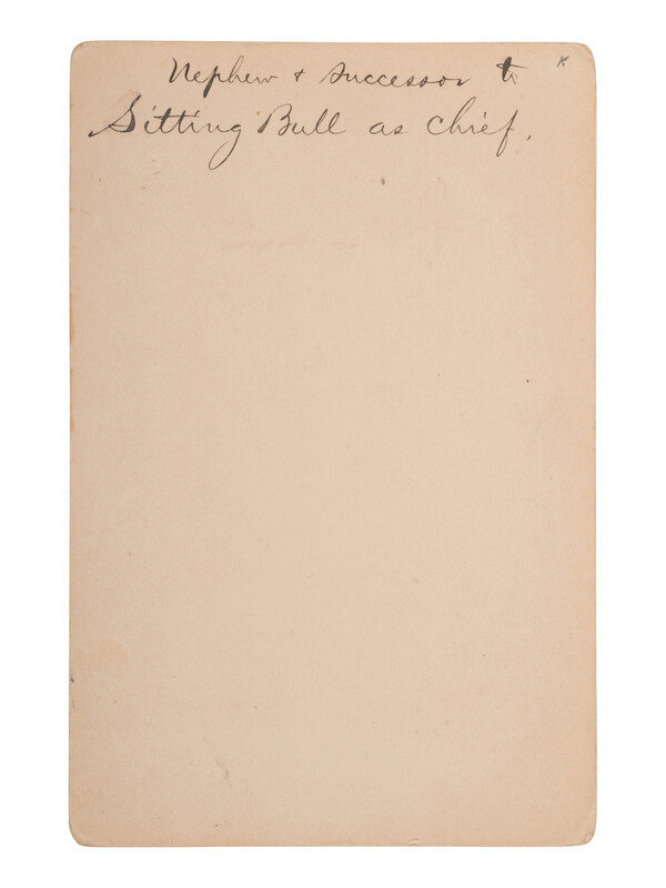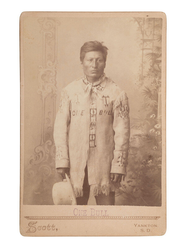 Cabinet photograph on cardstock mount of One Bull, with George Scott's Yankton, South Dakota imprint on mount recto. Verso with period notation, "Nephew & Successor to Sitting Bull as Chief."