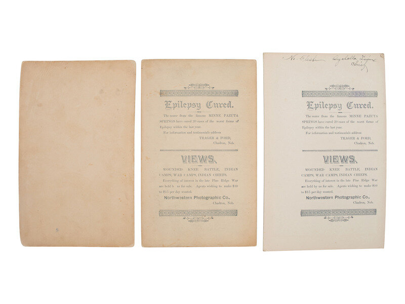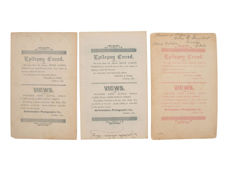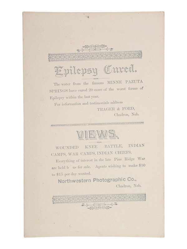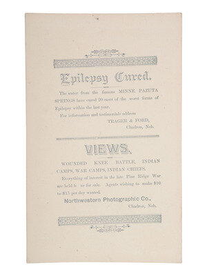 7 photographs, 7 1/2 x 4 3/8 in. or smaller, on cardstock mounts. Most with verso imprint advertising Trager & Ford's epilepsy-curing water from Minne Pazuta and Northwestern Photographic Company's views of "Everything of interest in the late Pine Ridge War" including the "Wounded Knee Battle." Most captioned and/or copyrighted in the negative. No photographer listed, but most likely captured by George Trager.