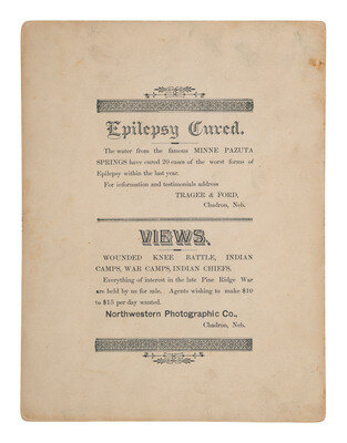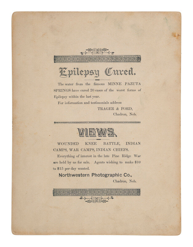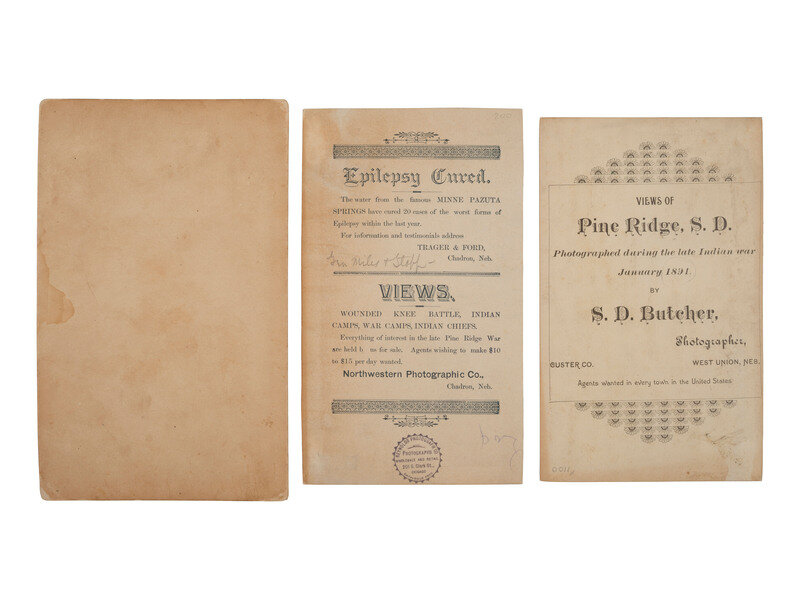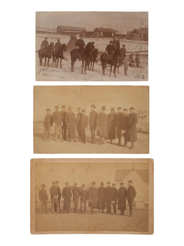 4 photographs, including three boudoir sized views, and one larger image, approx. 5 1/2 x 7 1/2 in. mounted on larger cardstock. Images by S.D. Butcher and Trager's Northwestern Photographic Co. of Chadron, NE, with the company imprint on verso. These images were taken during the first two weeks of January, 1891, after Wounded Knee, showing General Nelson Miles and members of his staff.