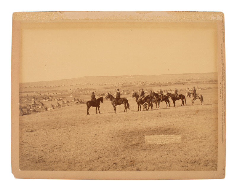 9 1/2 x 12 1/2 in. albumen photograph on cardstock mount with J.C.H. Grabill's copyright information and advertisement printed along the right edge. Identified in negative, "No. 3526 Gen. Miles and Staff. Viewing the largest hostile Indian Camp in the US near Pine Ridge, SD, Jan. 16, 1891."