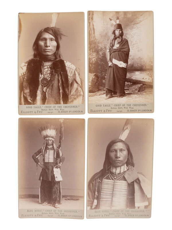 4 cabinet photographs on cardstock mounts, each with "Buffalo Bill's Wild West" mark on mount recto and the imprint of Elliott & Fry, 55 Baker St., London, on recto and verso. The subjects, who are identified on mount recto, were photographed while touring in England with Buffalo Bill's Wild West show in the summer of 1887. The following performers are included: "Good Eagle, 'Chief of the Cheyenner' [sic]," including half-length and full-standing portraits. -- "Blue Horse, 'Chief of the Shoshoner' [sic]," including half-length and full-standing portraits. -- Together, 4 cabinet photographs of identified Cheyenne and Shoshone chiefs.