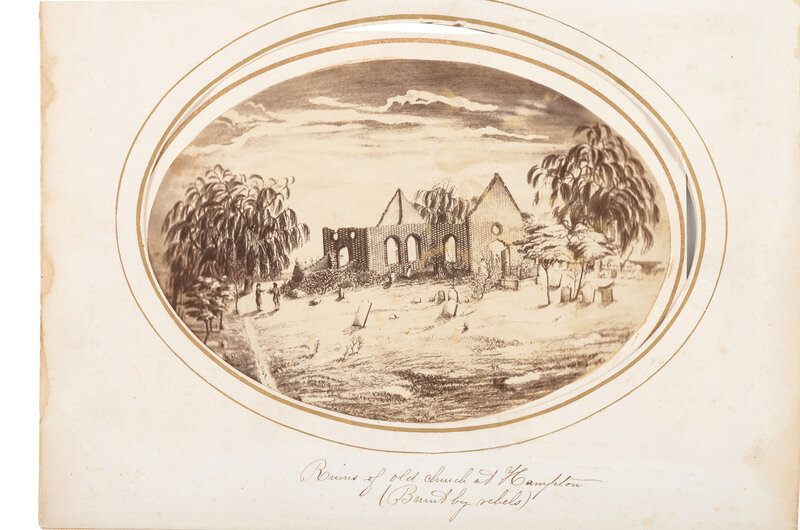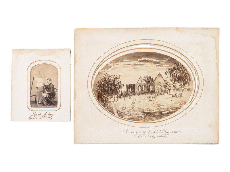 7 1/8 x 5 in. oval albumen photograph of a sketch captioned on disbound album page, "Ruins of old church at Hampton (Burnt by rebels)." Uncredited, n.d. The sketch appears to resemble that of the sketch upon which the artist in the above mentioned portrait appears to be working. The "old church" pictured is likely St. John's Episcopal Church, which was set ablaze, along with nearby homes and businesses, by Confederate forces in August of 1861 in their efforts to keep Union forces from occupying the town of Hampton.
