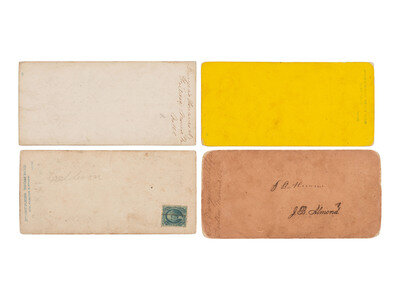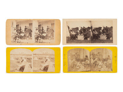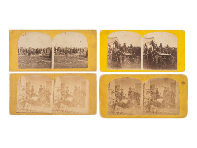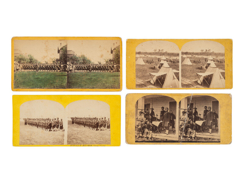12 stereoviews on mostly yellow mounts, some with printed or inscribed captions, none with photographers identified. Includes: 6 views identified as being captured at Fortress Monroe, including 2 examples of the same camp scene featuring tents, practice drills, mess/leisure activities, and a farcical view of Zouaves playacting an amputation scene. -- One view featuring a group using a trunk or field desk as a table for their food and beverages, with "N.C. Staff Mess / 5th Regt N.Y.S.T." printed on one side of the trunk/desk. An African American subject stands behind the group of soldiers, wearing a knife in a holster. -- 4 examples of the same view of Zouaves gathered on a porch and posed theatrically, with one man looking through a telescope into the distance and others posed with their weapons. (2 nearly separated along vertical creases, one with taped repair.) -- Color-tinted view of Zouaves arranged in rows in a green grass field, each with a long rifle held to one side. -- Together, 12 stereoviews.