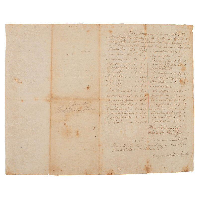 "An Recompts (or Enventory) of the Cloathing and Effects of Mr. Israel Smith. A Soldier in Captain Daniel Roe[']s Company of the Second Regiment of the New York Troops Commanded by James Clinton Esq. Coln." 3pp, 16 x 13 in. (creasing, toning, scattered spotting). An itemized list of personal effects including a blanket, great coat, haversack, shirts, vest, mittens, cash, shoes, knife, canteen, "bagg of sundries," pocket book, and gun. Signed by Captain John Belknap and Ensign Benjamin Titus. Titus adds a signed note below his first signature, "Received the above contents of Captain Daniel Roe For to be Delivered to the Deceased's Heirs." Verso with another accounting of the personal effects, as well as an itemized list of "Israel Smith's account" identifying expenses occurred by him such as "for the Doctor coming from Fort Constitution," "for a men going for the doctor," "for a shirt to be Buried in," and "for a winding sheet."
