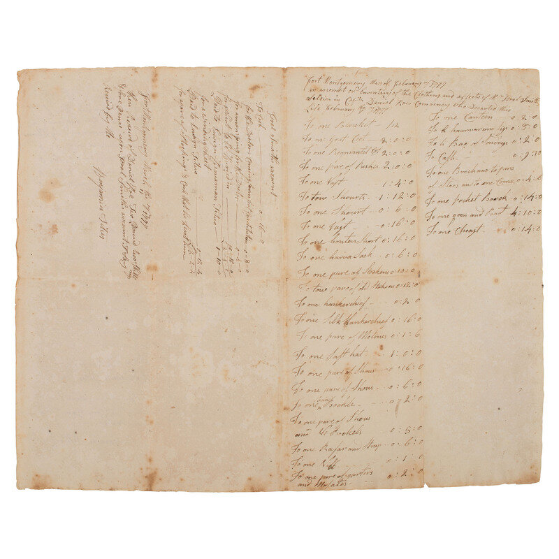 [REVOLUTIONARY WAR]. "An Recompts (or Enventory) of the Cloathing and Effects of Mr. Israel Smith...." Fort Montgomery, [New York]. 18 February 1777.