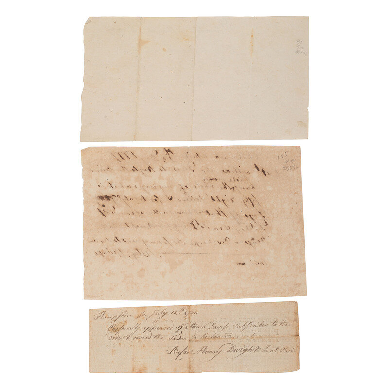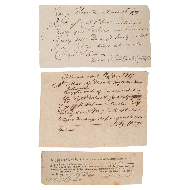 [With:] A group of 3 Revolutionary War-era receipts: Camp Tiverton, 28 March 1777, Captain Thomas receives of Captain Wilcocks "hundred and Eighty Good Cartridges, and hundred and Seventy Eight Damaged, Twenty one Ball Cartridges, Boxes with Seventeen Cartridges in them" -- Chillmark, 23 April 1777, A request for wages of fifty-eight dollars "for twenty one Days that I was on the alarm at 31 Dr Day" be paid by Captain Willcox. -- Partly printed receipt to John Avery, Secretary of the Commonwealth of Massachusetts, requesting wages be paid for service in "the late war."