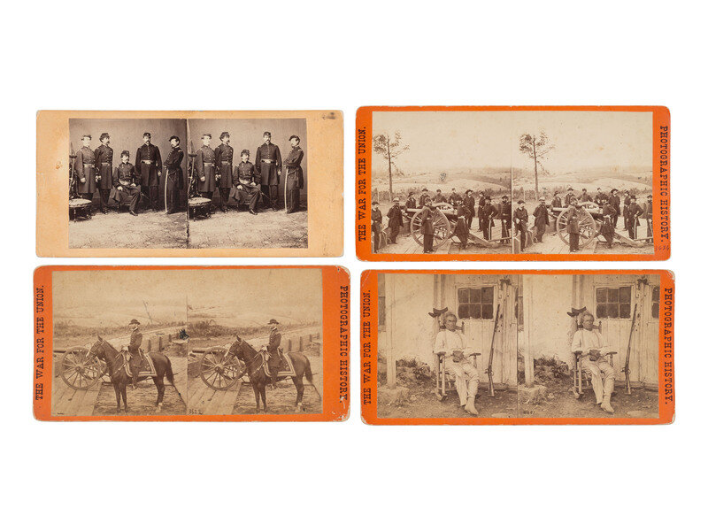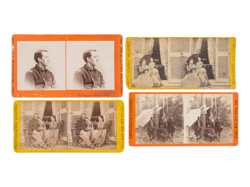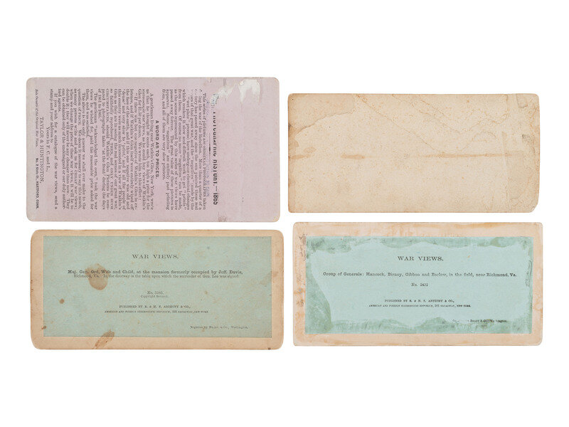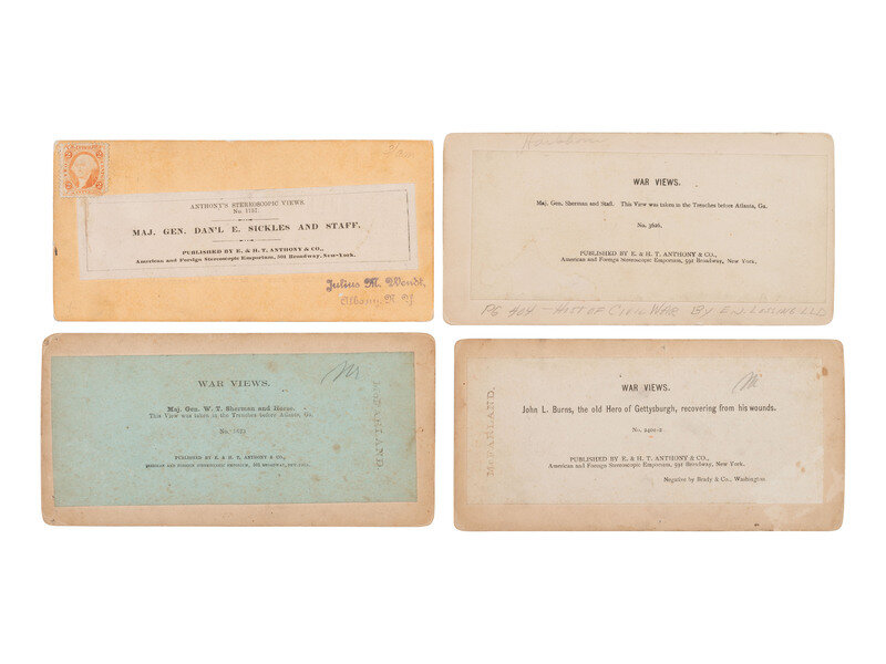 8 stereoviews on variously colored mounts, most with Anthony's "The War for the Union" series imprint to left/right margin and applied paper label to verso. Subjects include: Maj. Gen. Dan'l E. Sickles and Staff. -- Major General Francis C. Barlow. -- Maj. Gen. Ord, Wife and Child, at the mansion formerly occupied by Jeff. Davis... -- Group of Generals: Hancock, Birney, Gibbon and Barlow, in the field, near Richmond, Va. -- Maj. Gen. W. T. Sherman and Horse... -- Maj. Gen. Sherman and Staff... -- And others. -- Together, 8 stereoviews.