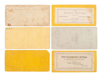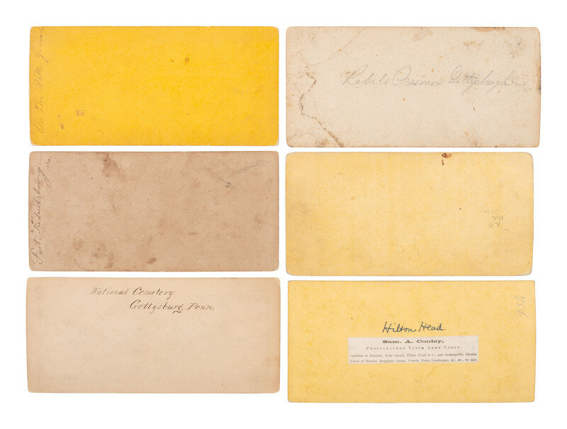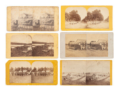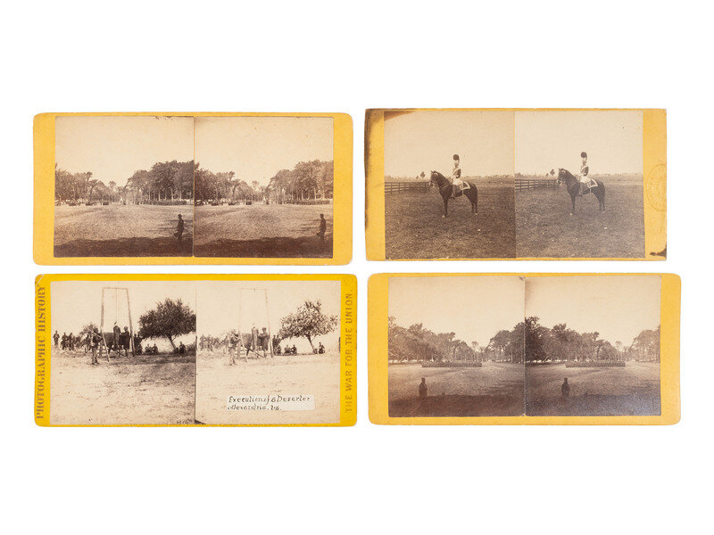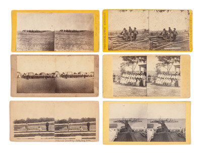 16 stereoviews on mostly yellow and buff mounts, some credited on rectos and/or versos to various photographers and publishers incl. Joshua Appleby Williams, Newport, RI; Bartlett & Smith; D. Barnum, Saratoga Springs, NY; Olden, Sawyer & Co., New York; Samuel A. Cooley; and E. & H. T. Anthony. Scenes include: Execution of a Deserter / Alexandria, V.A. -- National Cemetery - Gettysburg Penn. -- Rebel Prisoners. Gettysburgh [sic] -- Chief Quartermaster's Buildings at Chattanooga, Sherman's base of supplies. -- And others. -- Together, 16 stereoviews.